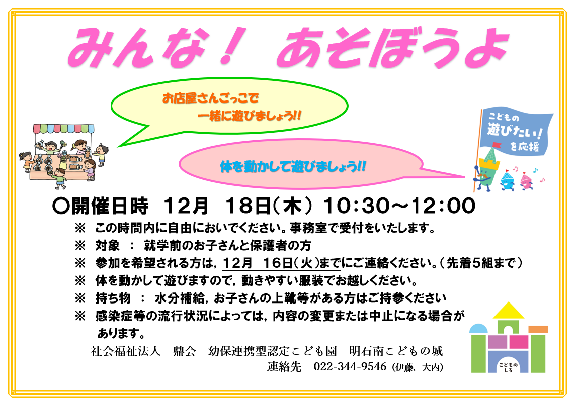 12月の地域子育て支援として,ごっこ遊びで一緒に遊んだり,体を動かして遊びます。