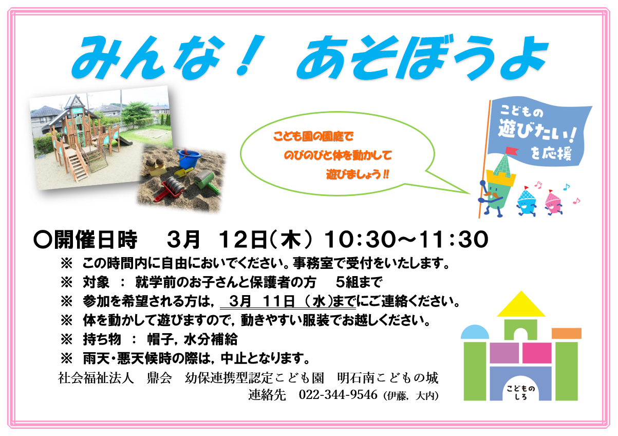 11月の地域子育て支援として,園庭開放を行います。体を動かして遊びますので,動きやすい服装・履き慣れた外靴で参加ください。